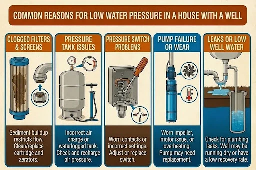 Low water pressure in a house on a well can be incredibly frustrating. One minute your shower feels normal, the next minute it turns weak when someone runs a sink or the washing machine starts. The good news is that most well water pressure problems come from a small set of causes, and once you identify the real bottleneck, the fix is usually straightforward.